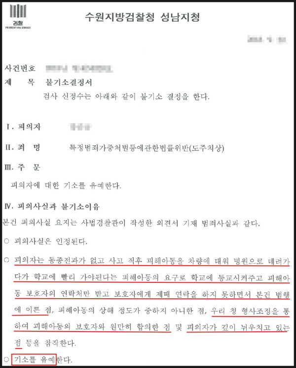 피해 아동의 부모와 원만히 합의하여 검사로부터 기소유예 처분을 받게 되었으며,